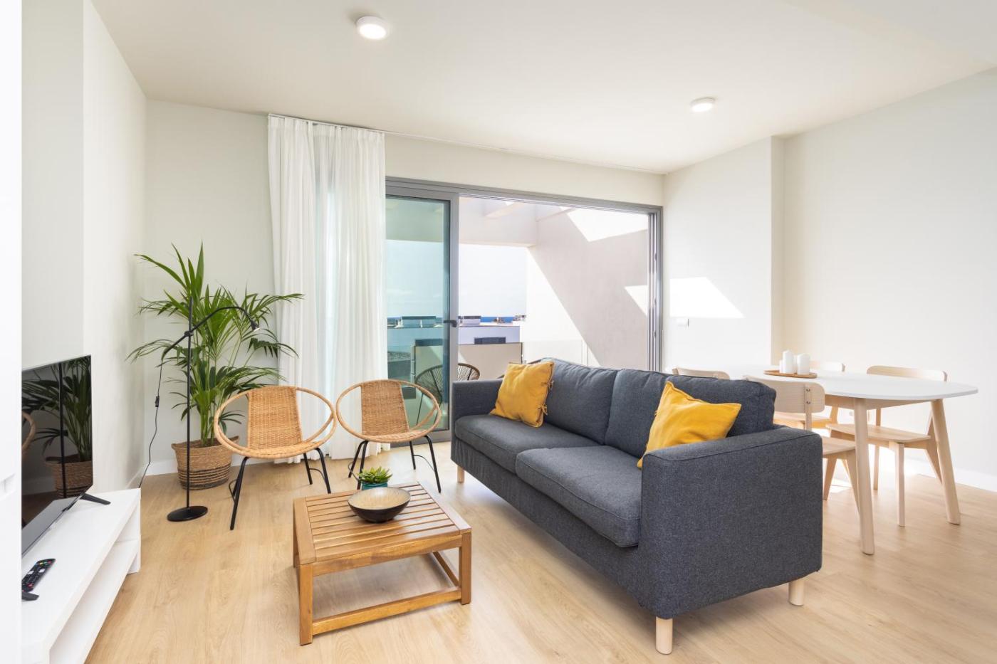 El apartamento cuenta con 2 dormitorios, 2 baños, ropa de cama, toallas, TV de pantalla plana, zona de comedor, cocina totalmente equipada y balcón con vistas al mar.