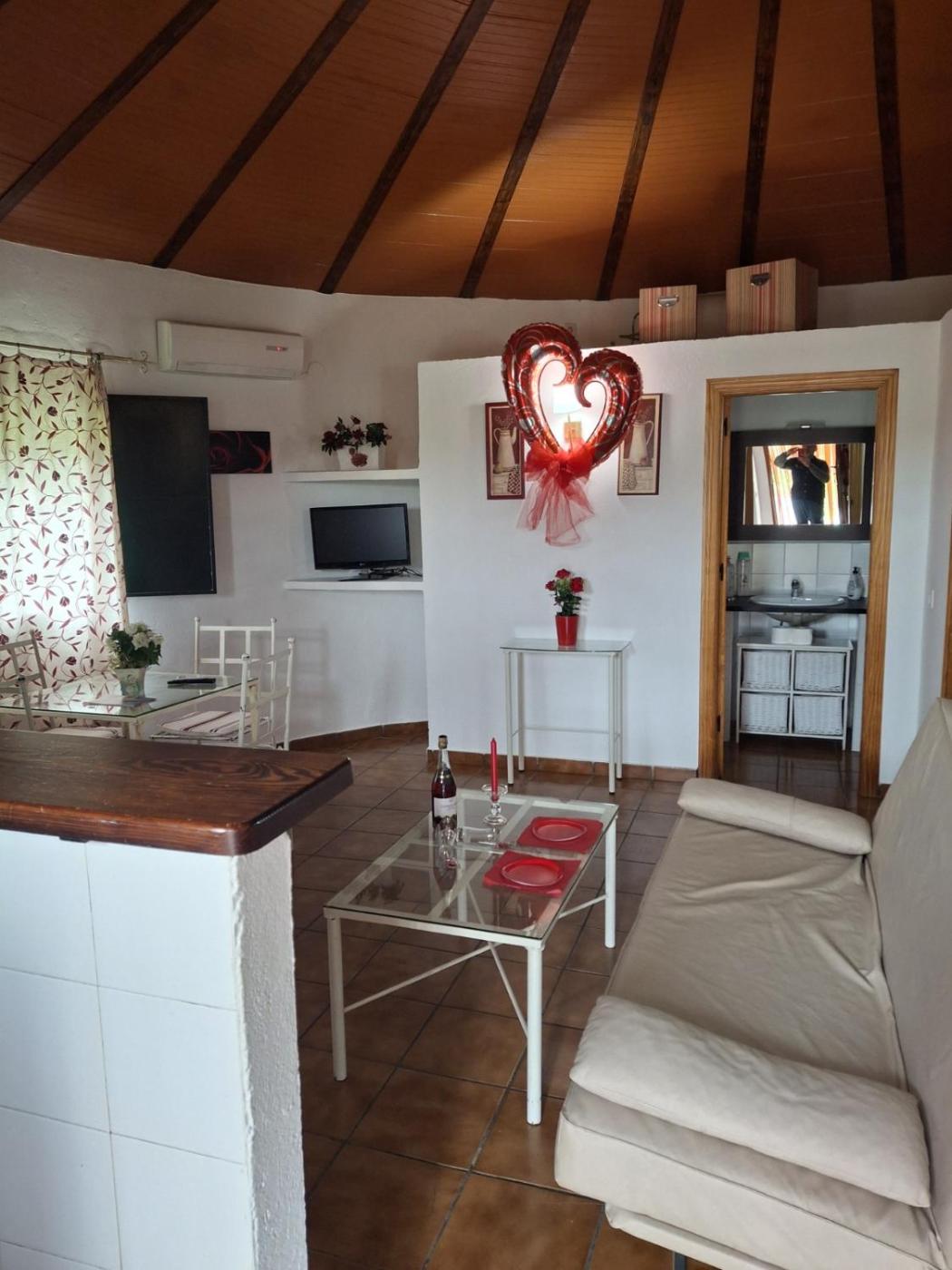 Casita de campo con 2 camas individuales. This charming, circular-shaped cottage features a thatched roof, stone walls, and a terrace overlooking gardens. It has 2 single beds, and a seating area with a fireplace, air-conditioning, flat-screen TV and a sofa bed. The kitchenette comes with a fridge, microwave, a coffee maker electric hob and kitchenware.