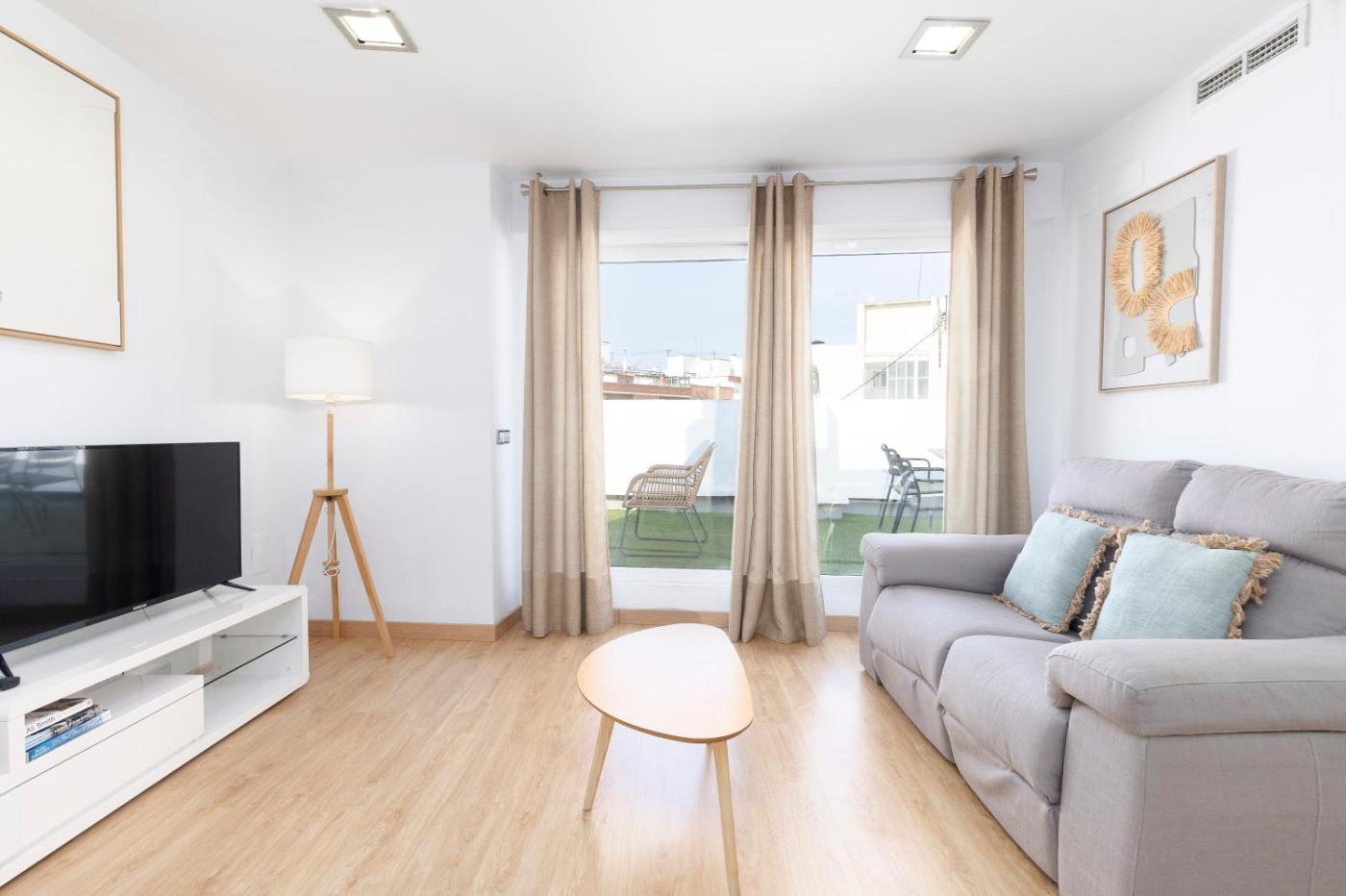 Apartamento Ático de 2 dormitorios. Este apartamento está en la última planta y dispone de terraza privada, suelo de madera, aire acondicionado y sala de estar con sofá y TV de pantalla plana. La zona de cocina incluye vitrocerámica, horno y cafetera. El baño incluye ducha y secador de pelo.